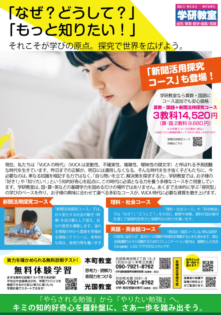 学研光国教室は「新聞活用探求コース」の認可教室です。お気軽にお問合せください。